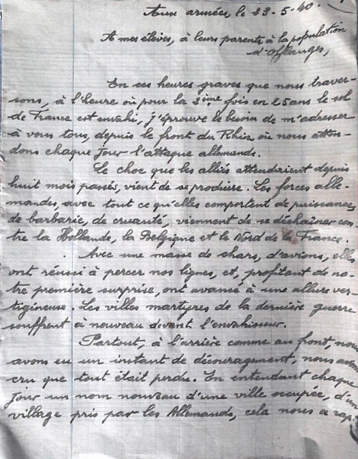 En ces heures graves que nous traversons, à l’heure où pour la 2ème fois en 25 ans le sol de France est envahi, j’éprouve le besoin de m’adresser à vous tous, depuis le front du Rhin où nous attendons chaque jour l’attaque allemande.
