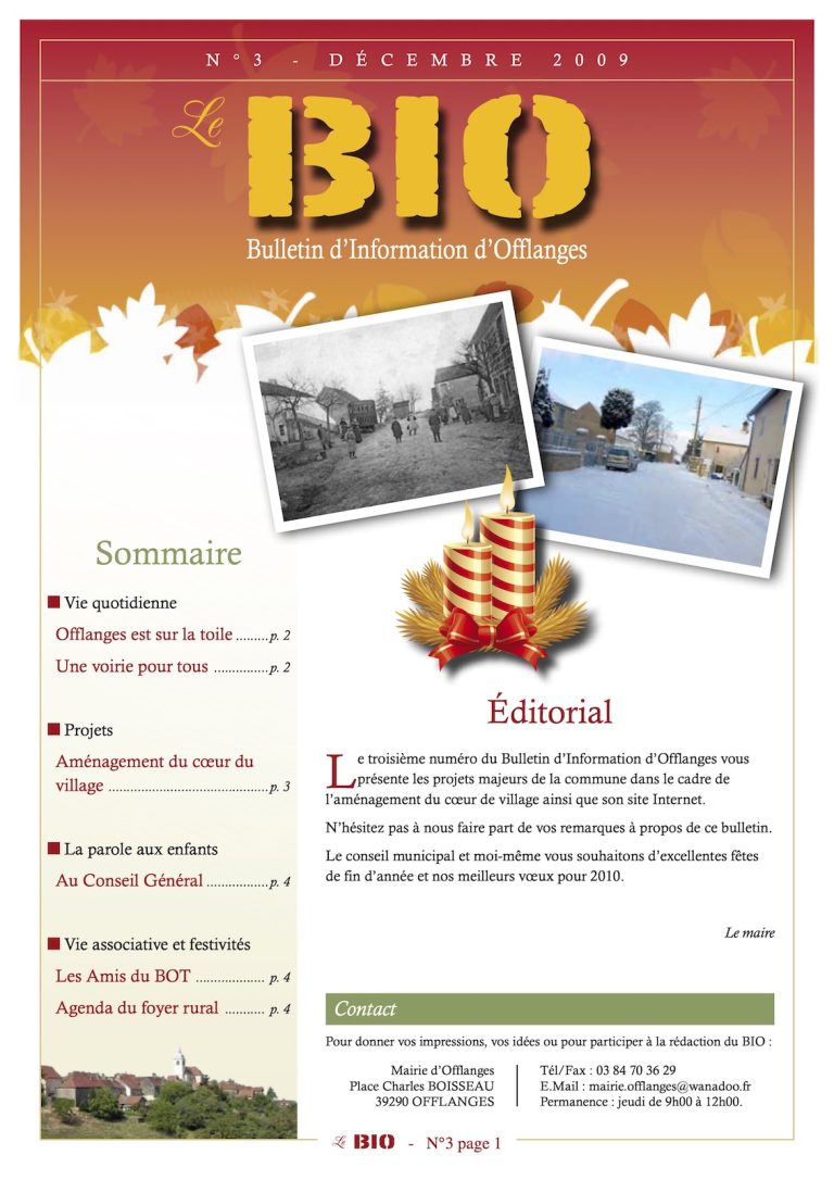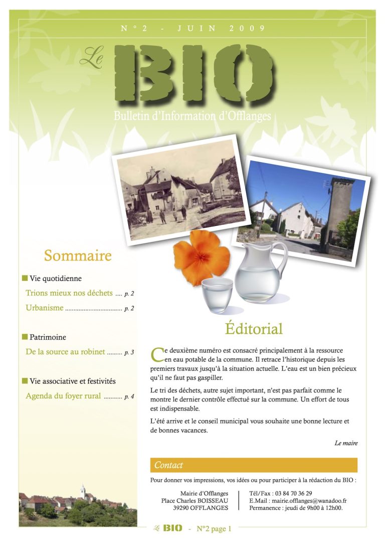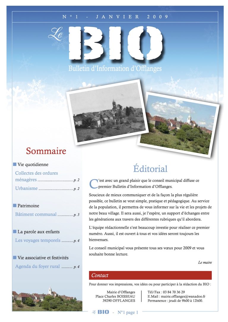 Le BIO (Bulletin d’Information d’Offlanges) et le bulletin des offlangeois et des offlangeoises. C’est un lien entre concitoyens, un lien utile qui ne doit pas être un vecteur à sens unique : ses colonnes sont ouvertes à vos contributions, qu’il s’agisse d’actualités associatives ou de fragments d’histoire locale…